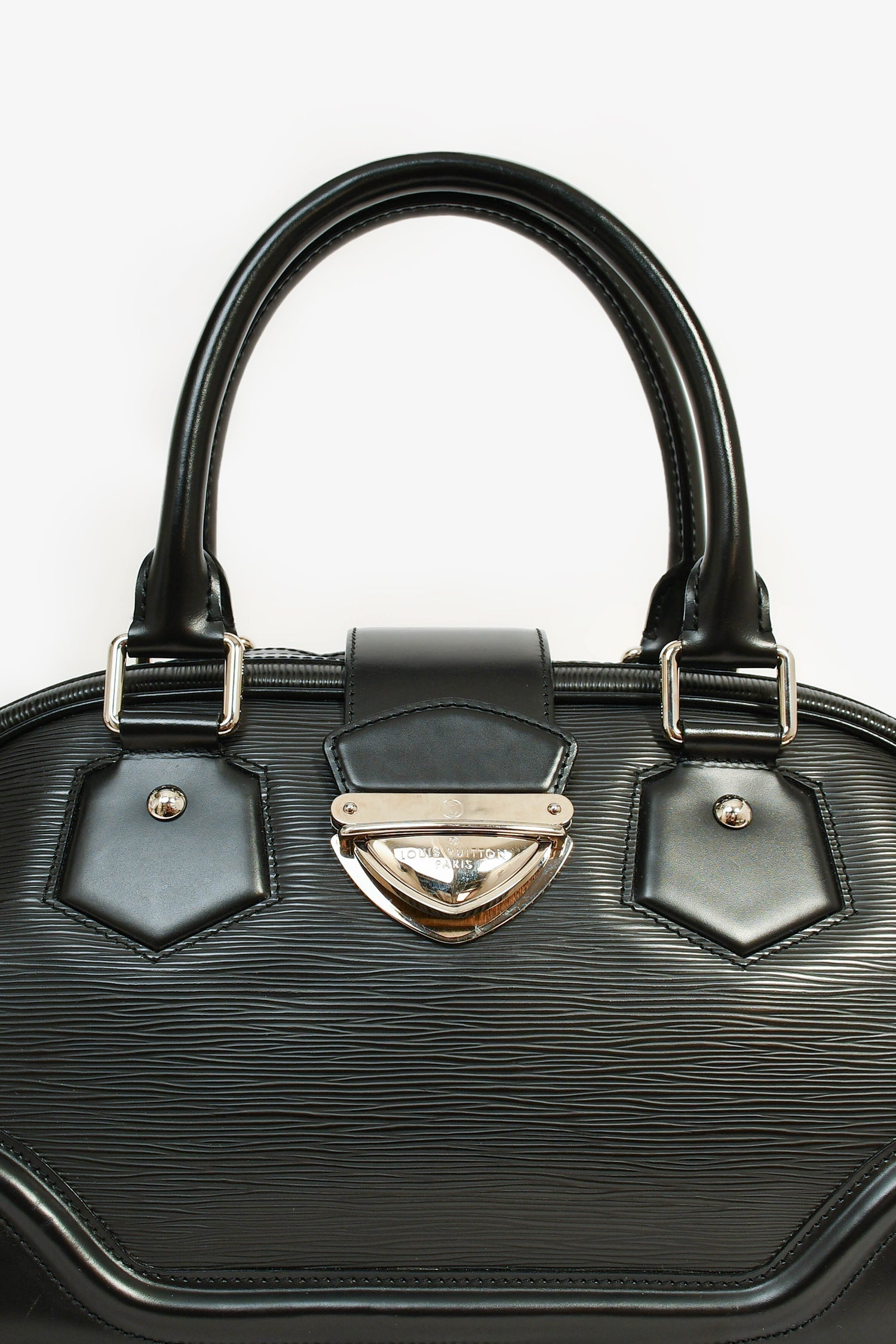 Louis Vuitton Black Epi Leather Bowling Bag. 2 top handles. Silver-tone hardware. Leather trim. Lined interior with 2 pockets. Fold-over strap. Tonal stitching.
